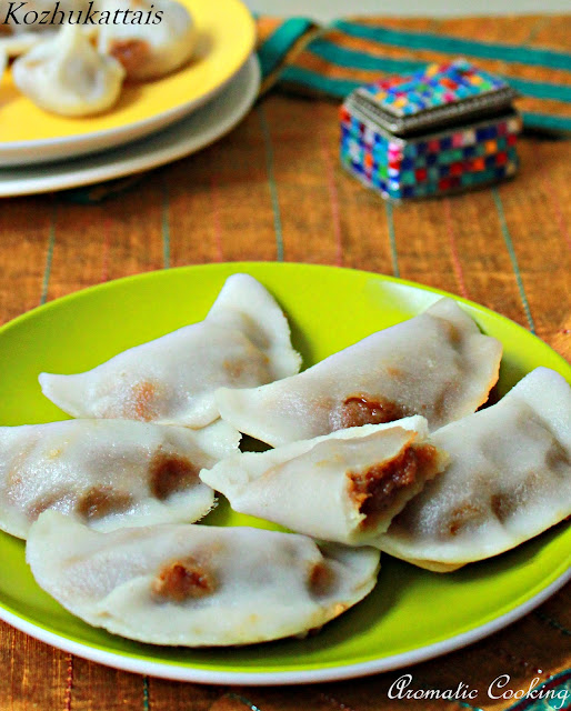 As today is Ganesh Chathurthi and I made these kozhukattais, I thought it would be apt to post this today. Kozhukattai is a very traditional sweet, sort of like steamed dumplings, the outer layer is with rice flour and the stuffing varies from sweet to savory. I have used the rice flour that my mother prepares, she uses the same flour for idiyappam and puttu, I think I have to do a separate post on how to make that rice flour. I used a chana dal + coconut + jaggery filling, the kozhukattais came out very soft and yummy..