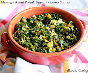 When something is available in abundance, we don't appreciate it, but then, when the same thing is not available easily, then you start liking it more. As far as food is concerned, this applies a lot, as a kid I didn't like sundakkai/turkey berries, vazhaithandu, small bitter gourds/midhi pavakkai and then the different varieties of greens/keerai, especially murungai keerai/ drumstick leaves. Forget about finding it when I was in the US, but even after coming to India, I don't get this keerai/greens that much here in Bangalore, or at least where I stay. So, now when I see it sometimes, I just get a couple of bunches. Usually my mom prepares this poriyal separately or along with vazhaipoo/banana flower, either way I love it. If you stir fry just the greens alone, it might not be that tasty, but the dal/lentils and grated coconut give it a nice taste and it goes well with rice and sambar/kuzhambu..